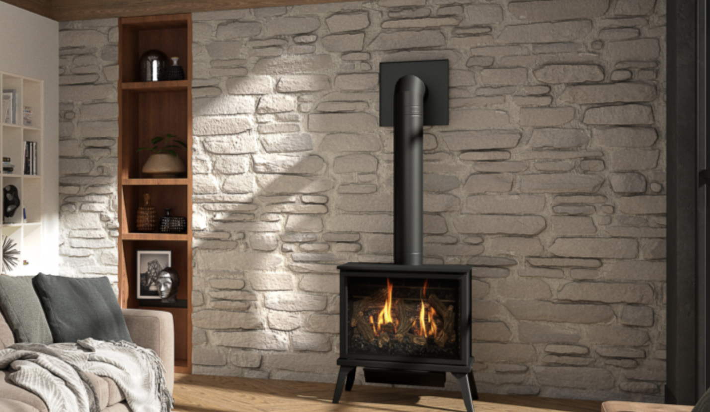 Poêle autoportant avec foyer au gaz à évacuation directe.